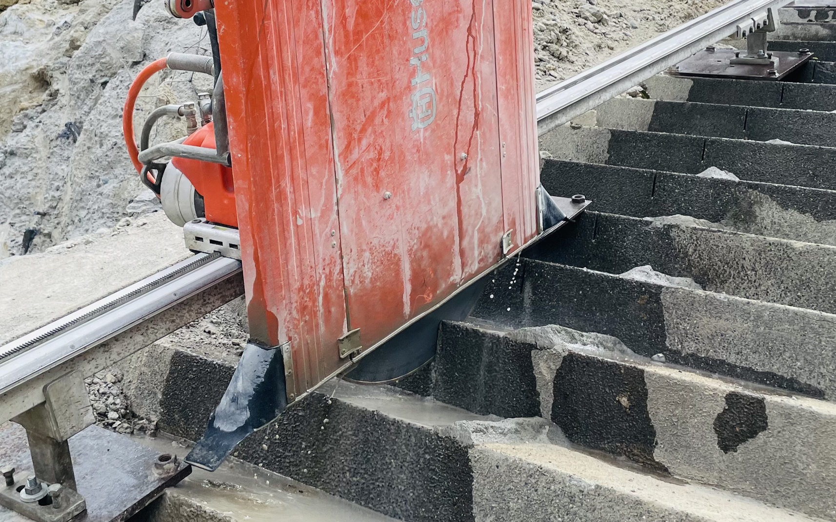 切断対象にアンカー打設しレールをセット、機会を設置しレールに沿って切断します。ワイヤーソーと同様にコンパクトな設計となっており低騒音・低振動が基準となっている現場では周囲の騒音環境に配慮し施工することができます。また漏水できない現場での施工には集塵機能が付いた乾式ウォールソーでの施工をお勧めします。