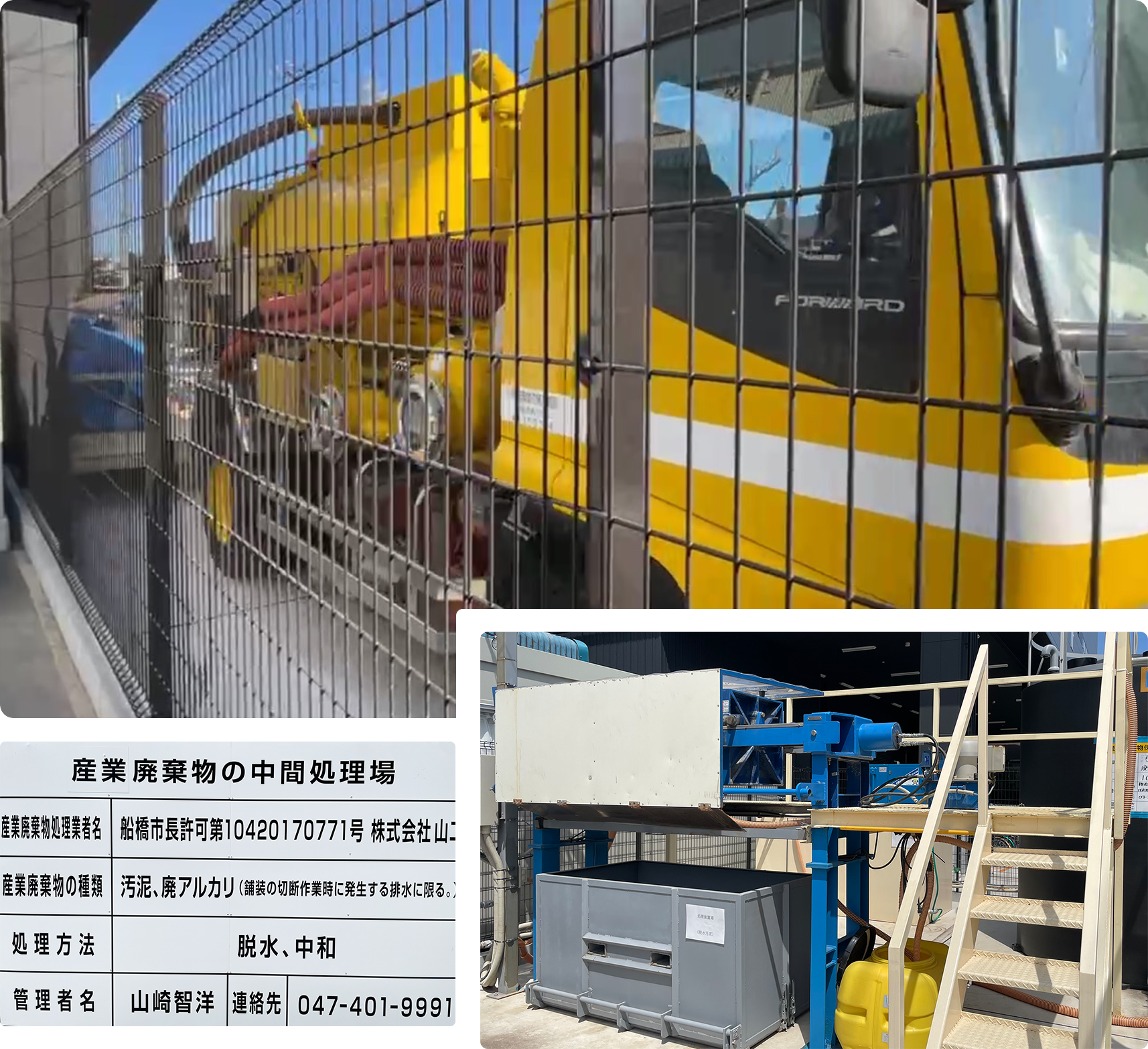 カッター切断工事から汚泥の収集運搬、中間処理に至るまで、弊社で責任を持って一括でお引き受けします。アスファルトだけでなく、特別管理産業廃棄物に該当するpHの高いコンクリート切断汚泥にも対応しております。またバキューム車による回収作業も行っております。